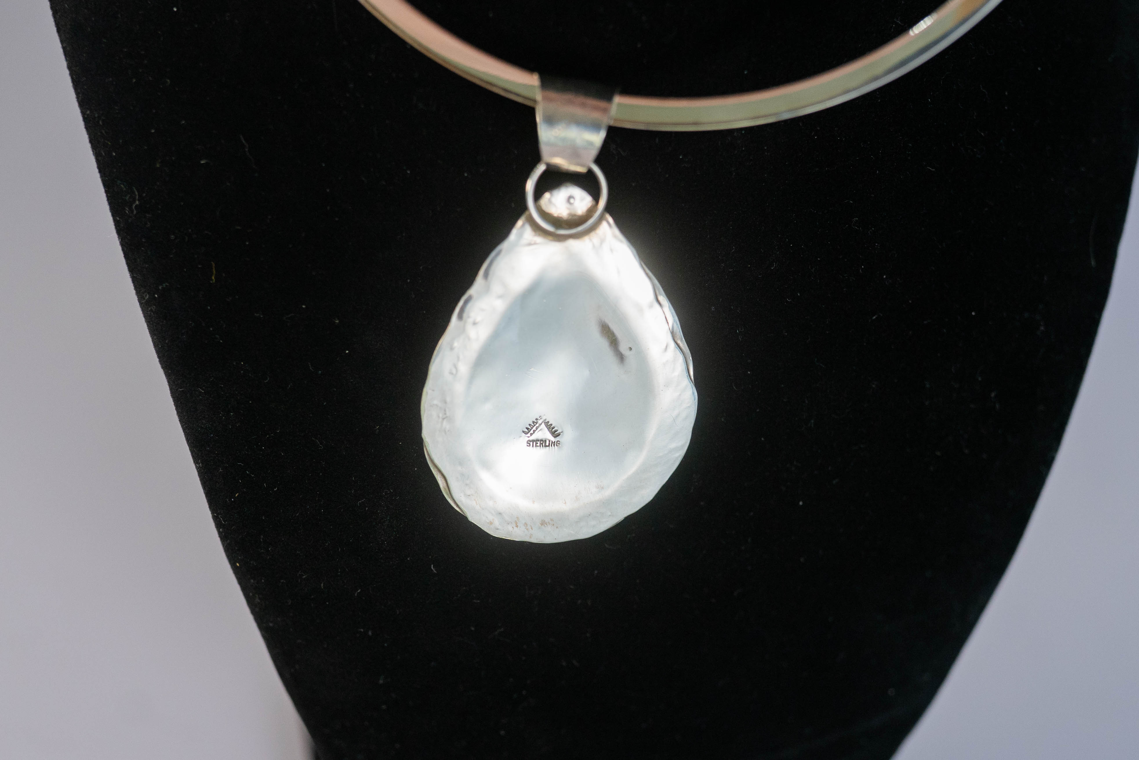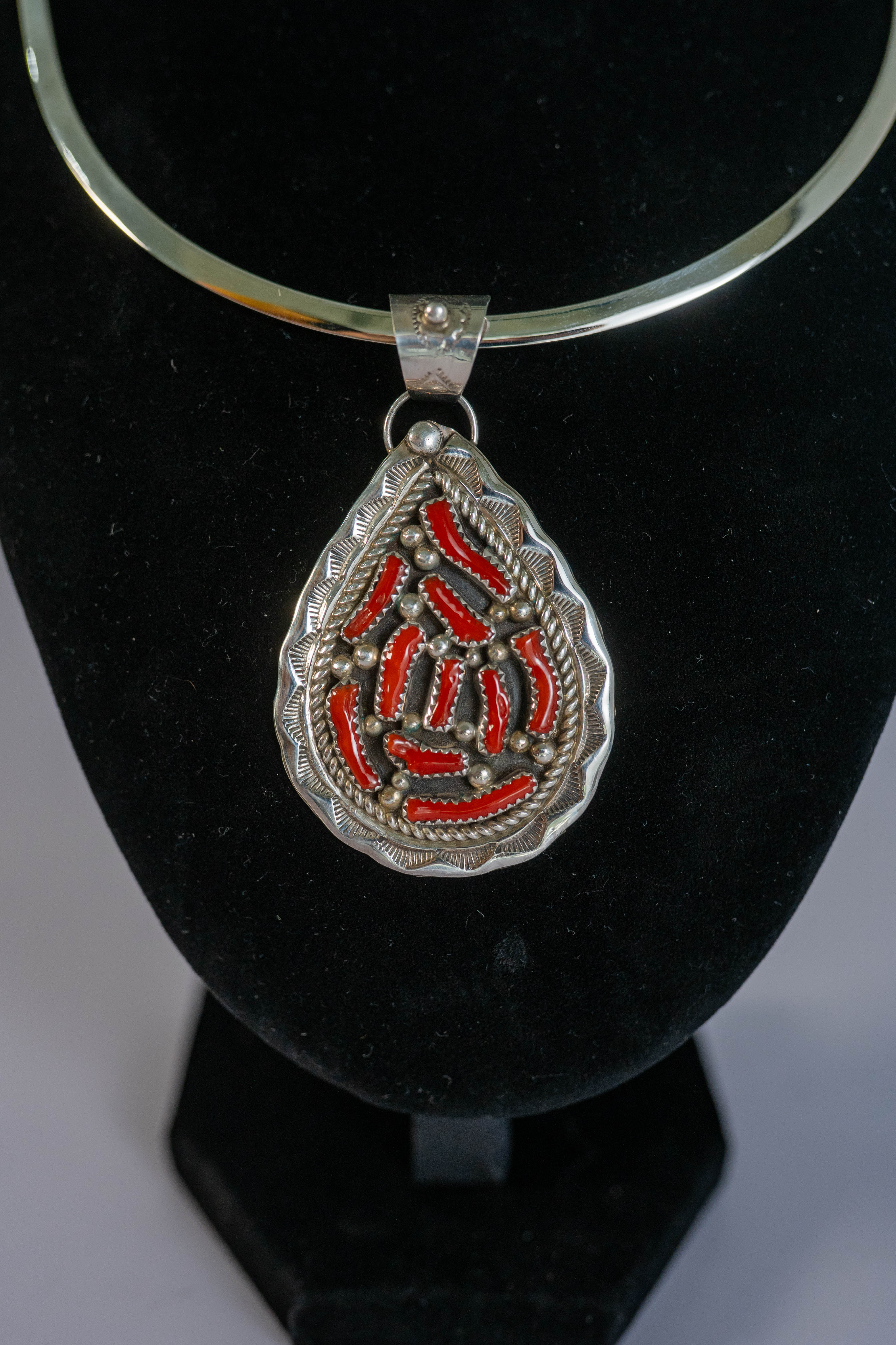 Native American Navajo vintage sterling silver pendant, hand tooled and hand stamped with (10) AAAA Mediterranean Coral gemstones, bead appliques and twisted wire. The pendant is on a 16″ sterling silver choker necklace. The pendant is L 2 1/2″ x 1 5/8″ W. Signed with a mountain and pine trees pictorial hallmark.