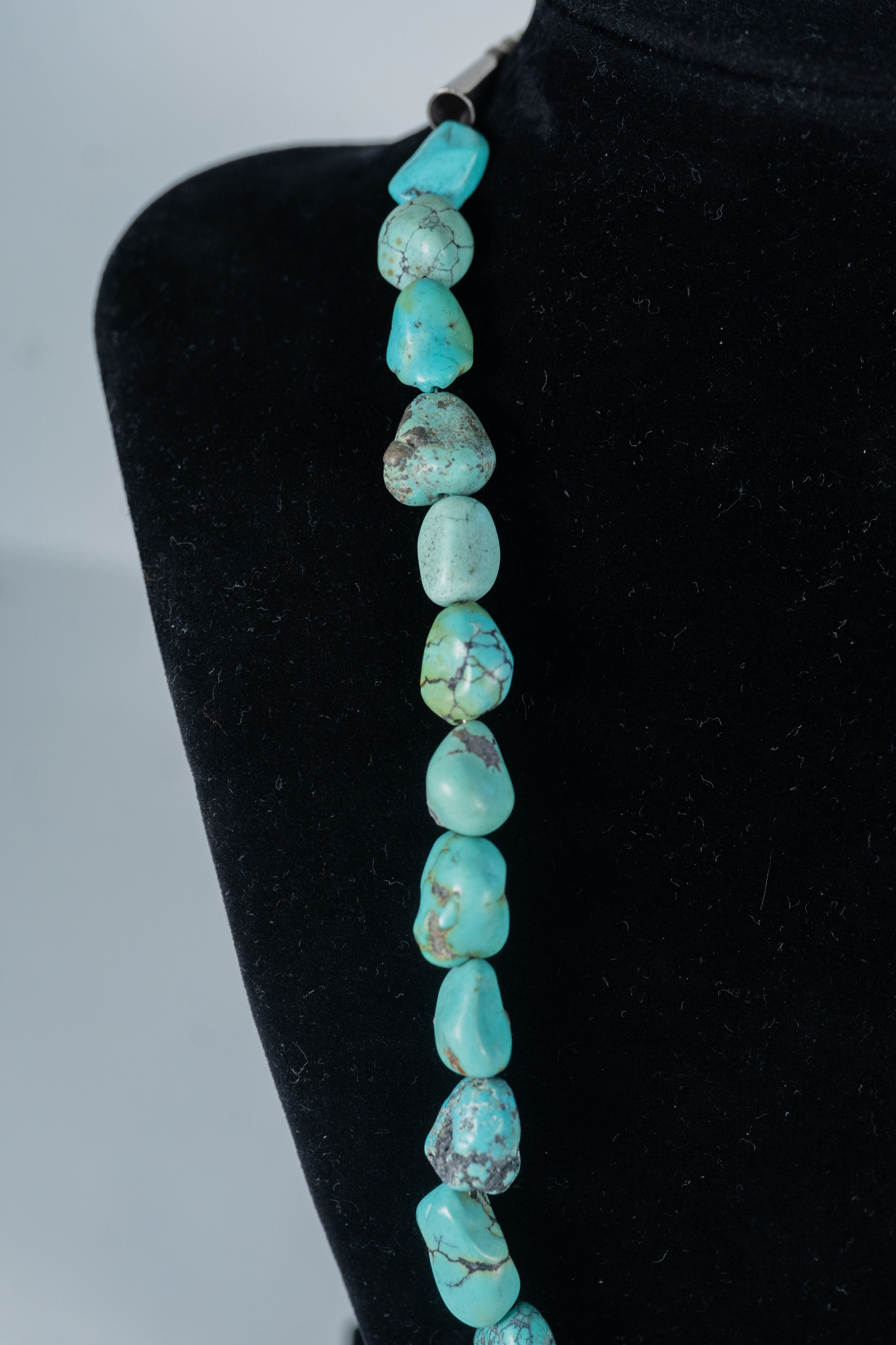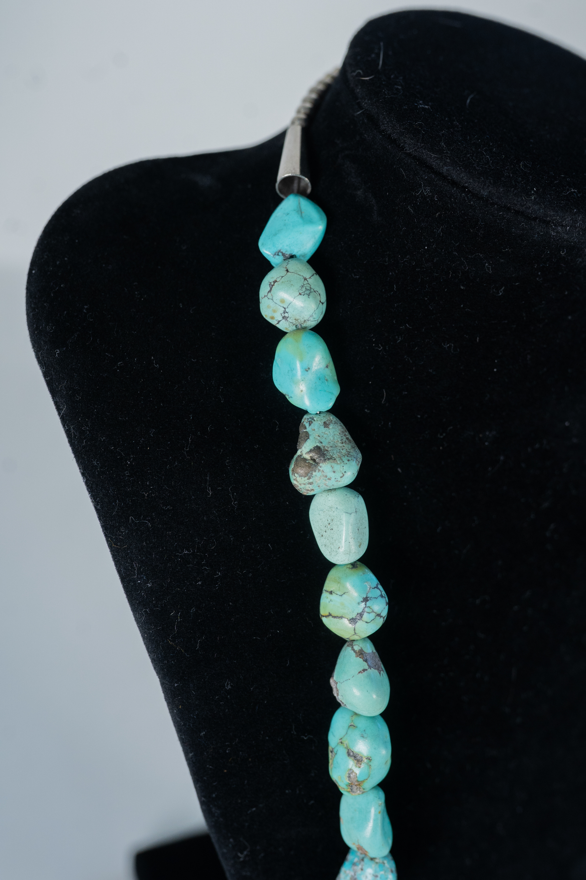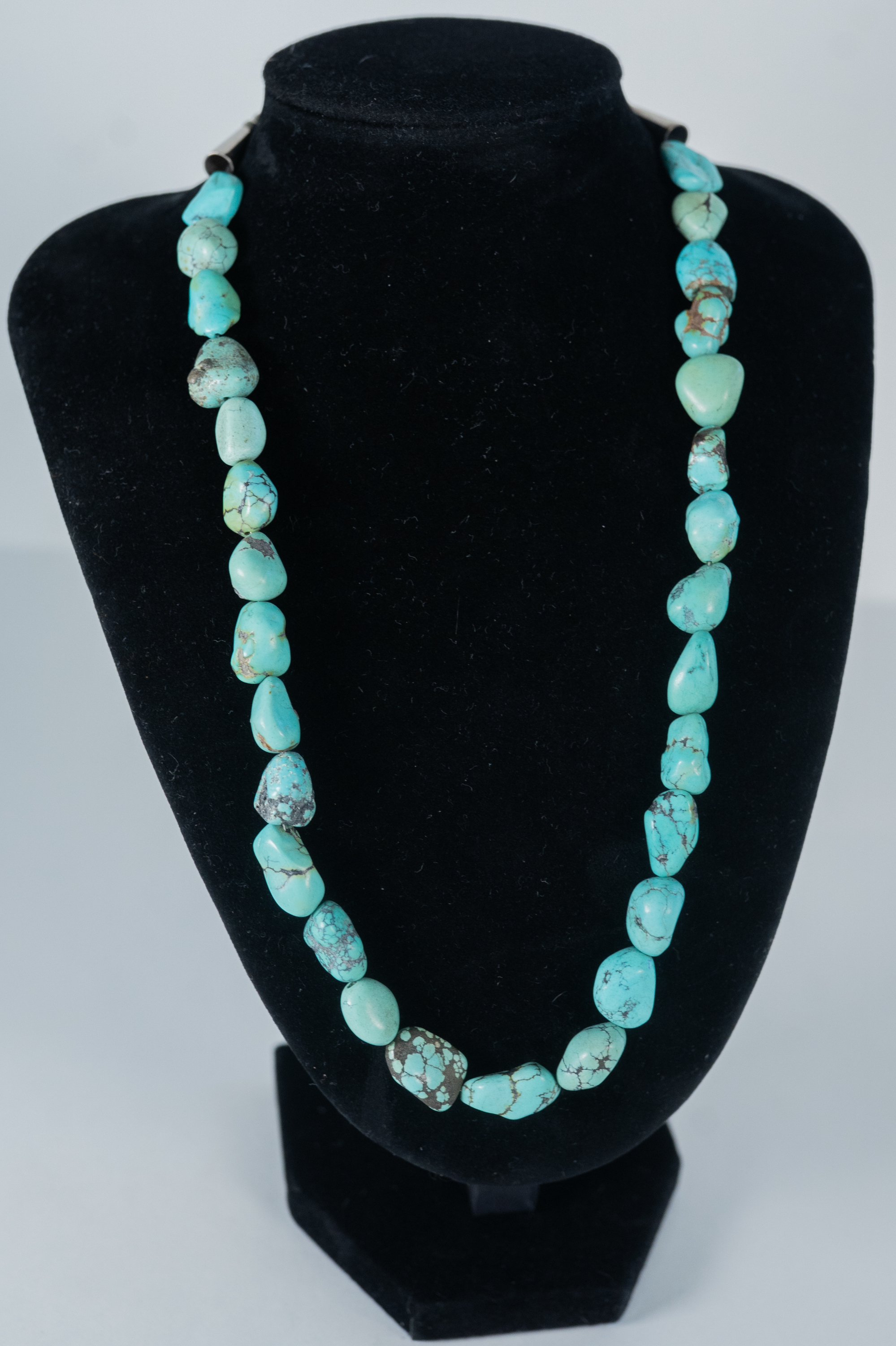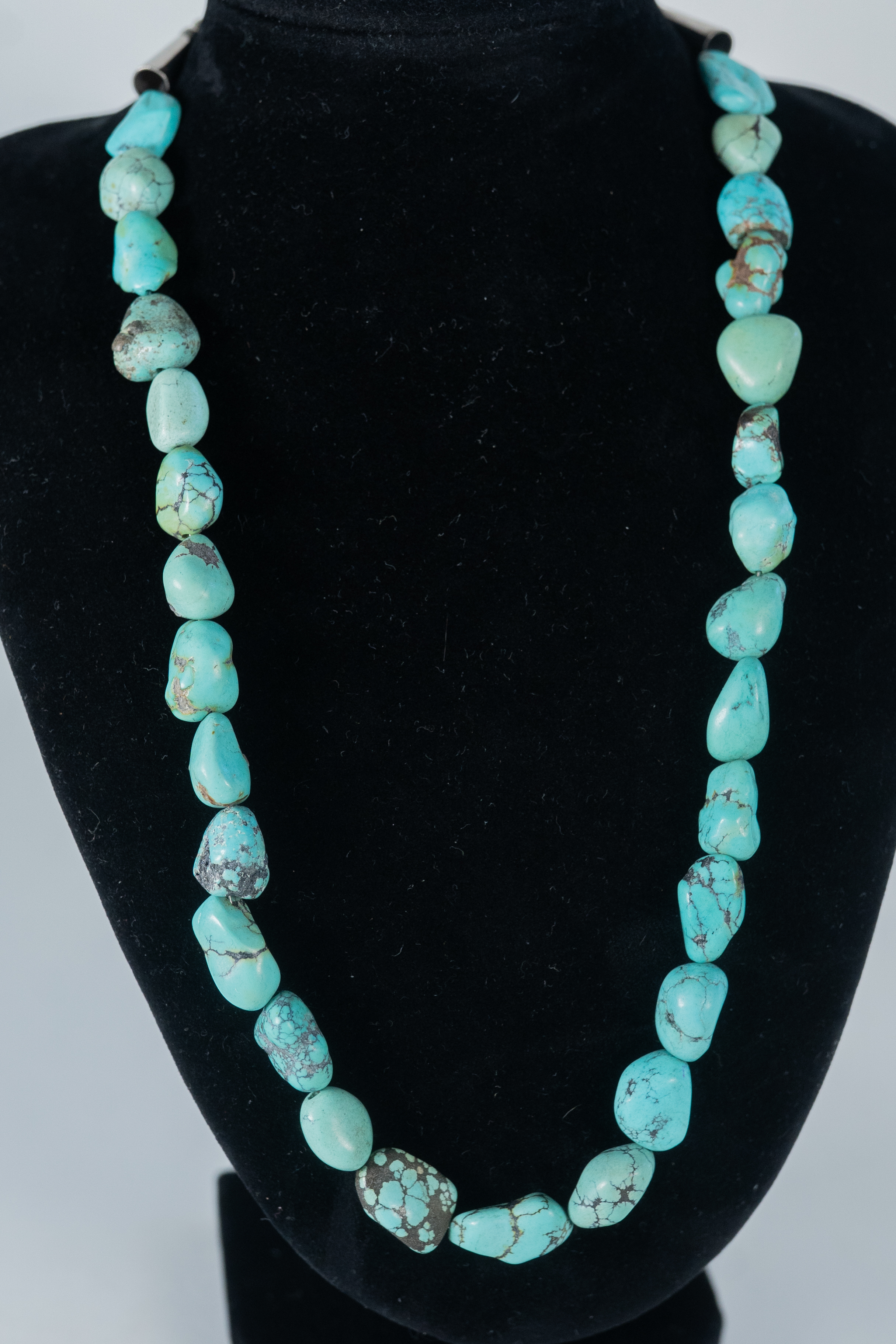 Native American Navajo vintage Kingman Turquoise nugget necklace with sterling silver cones, accent beads and findings. Nugget sizes range from 11mm x 10mm to 19mm x 10 mm. Length 20″.