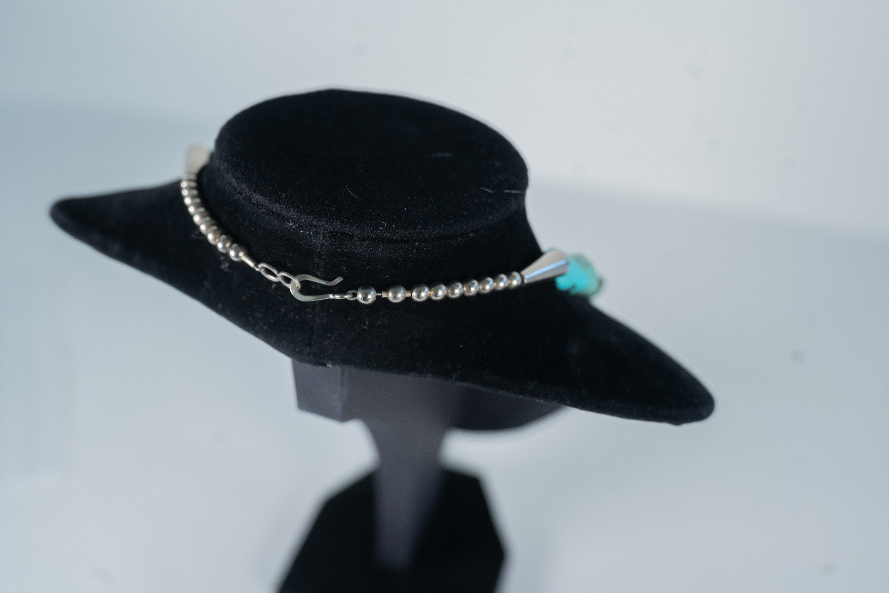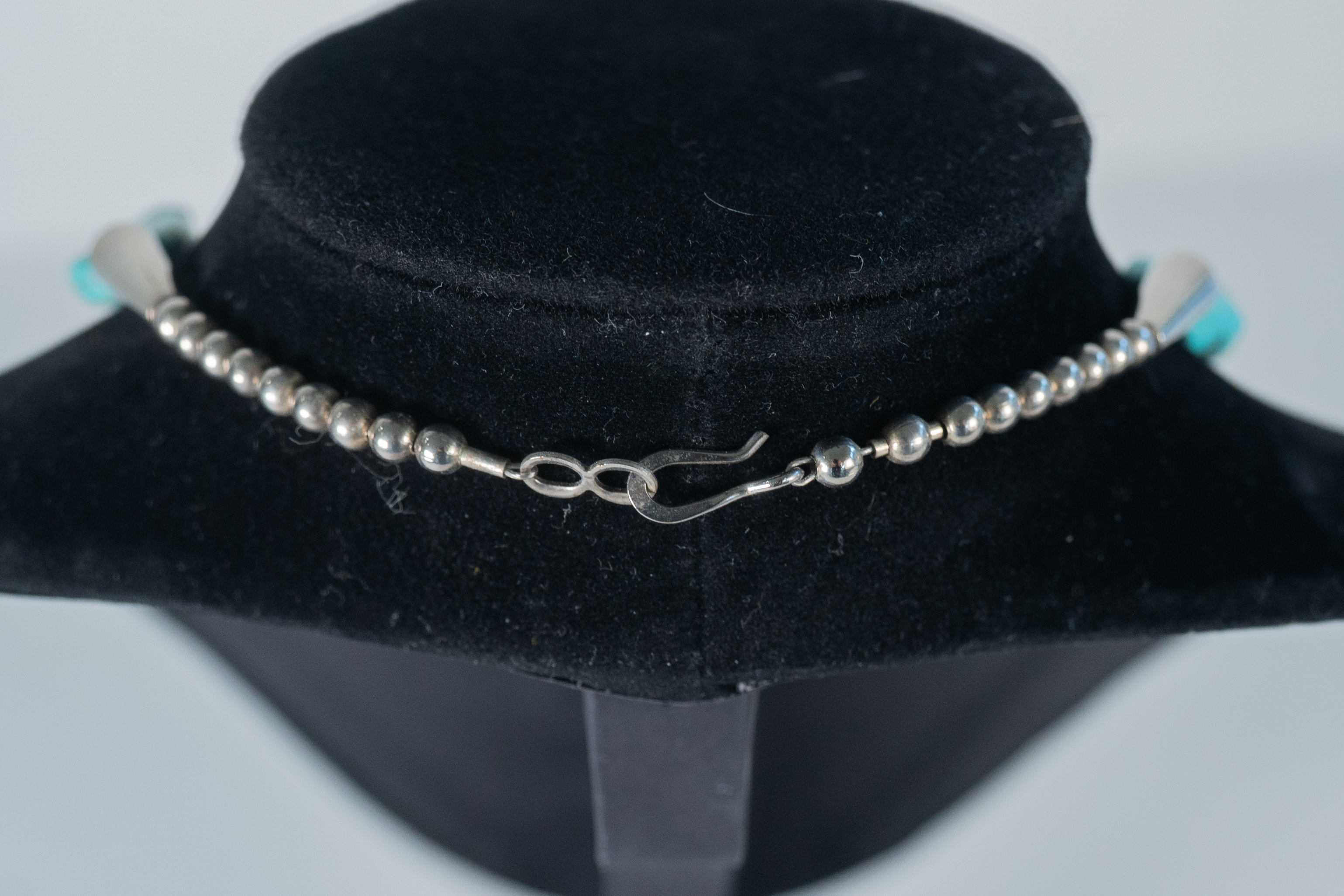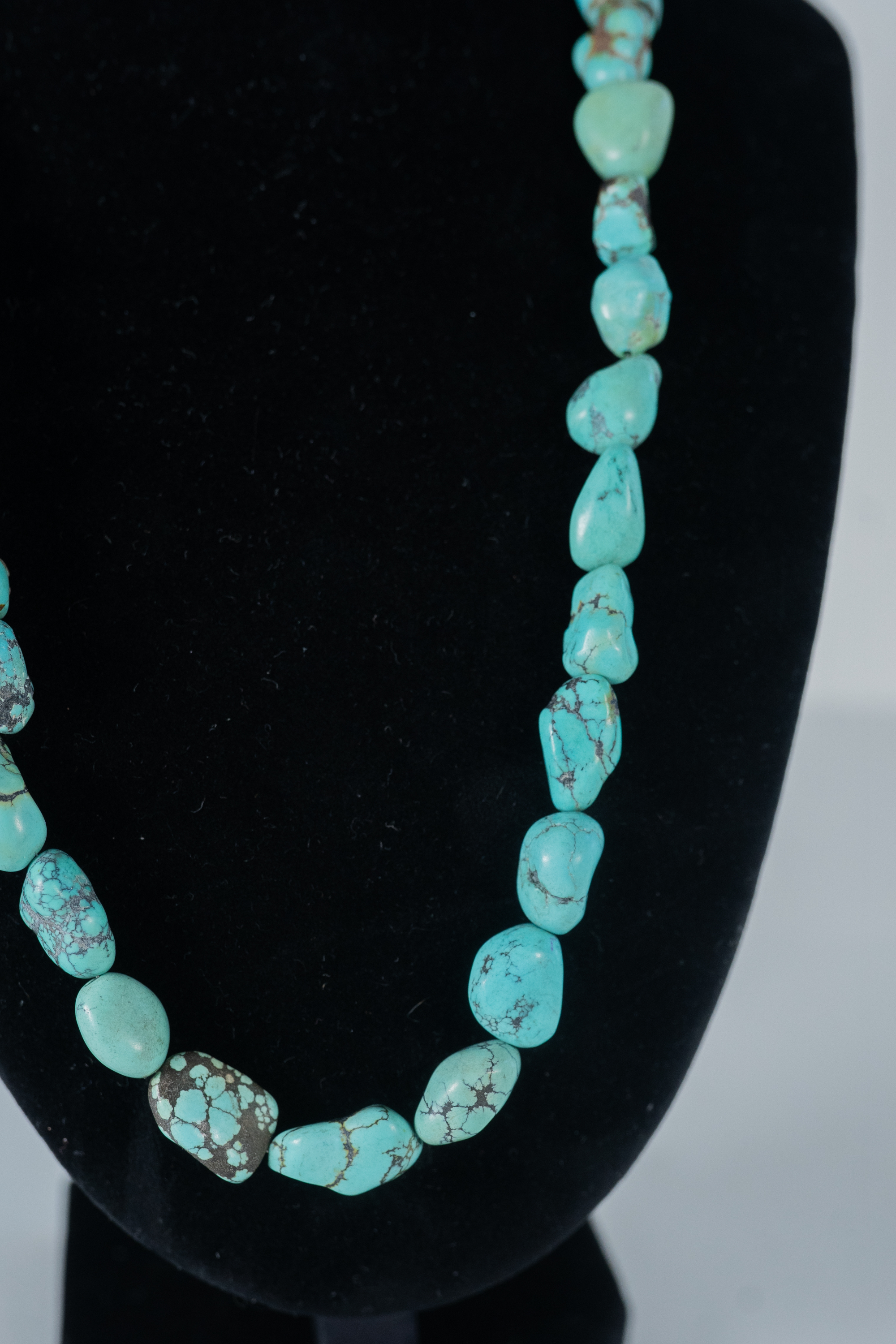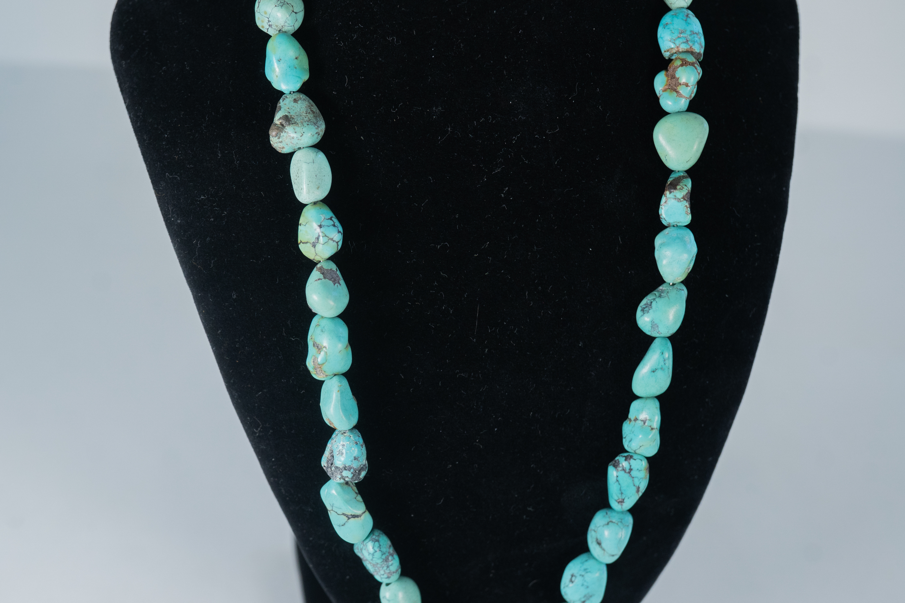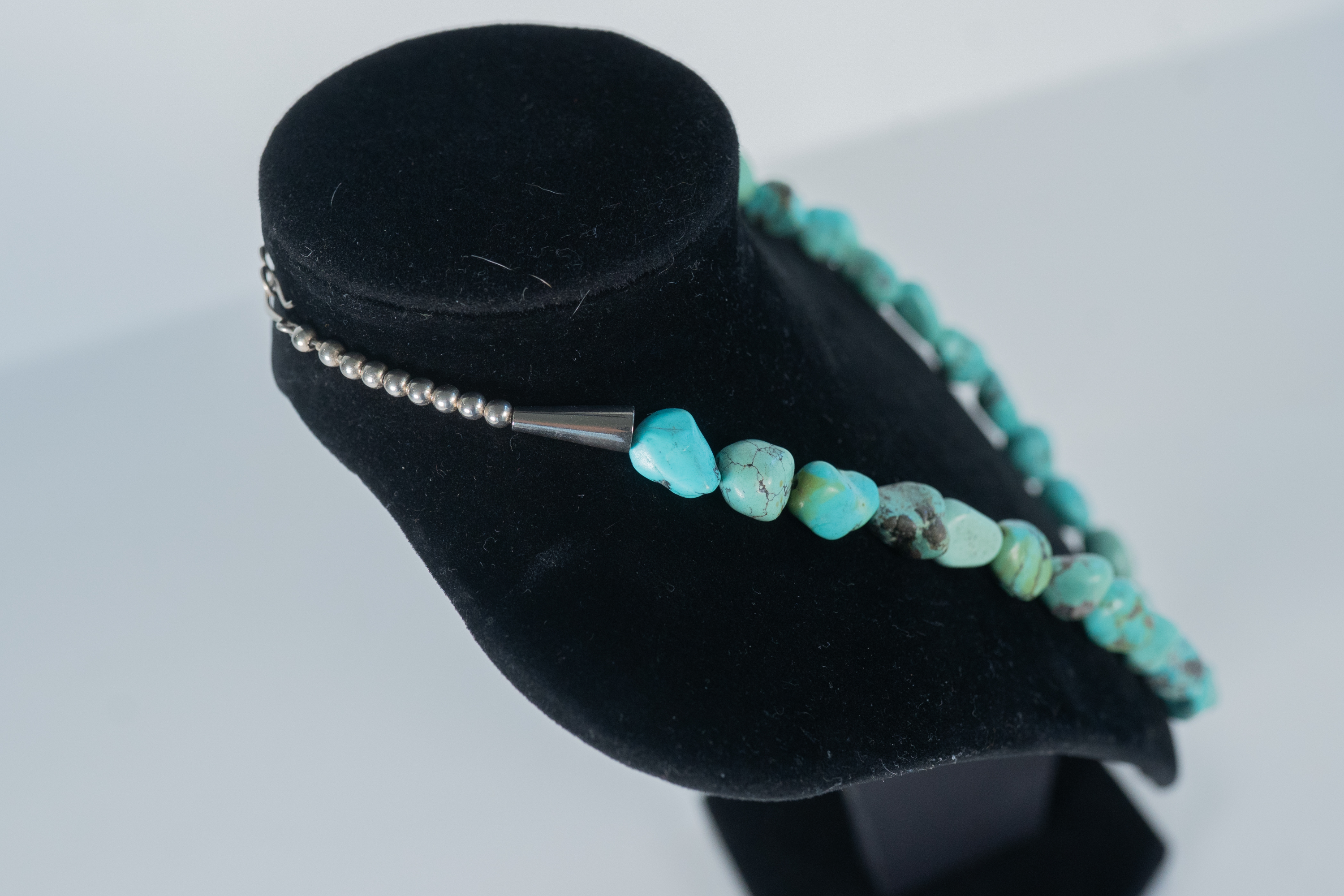 Native American Navajo vintage Kingman Turquoise nugget necklace with sterling silver cones, accent beads and findings. Nugget sizes range from 11mm x 10mm to 19mm x 10 mm. Length 20″.