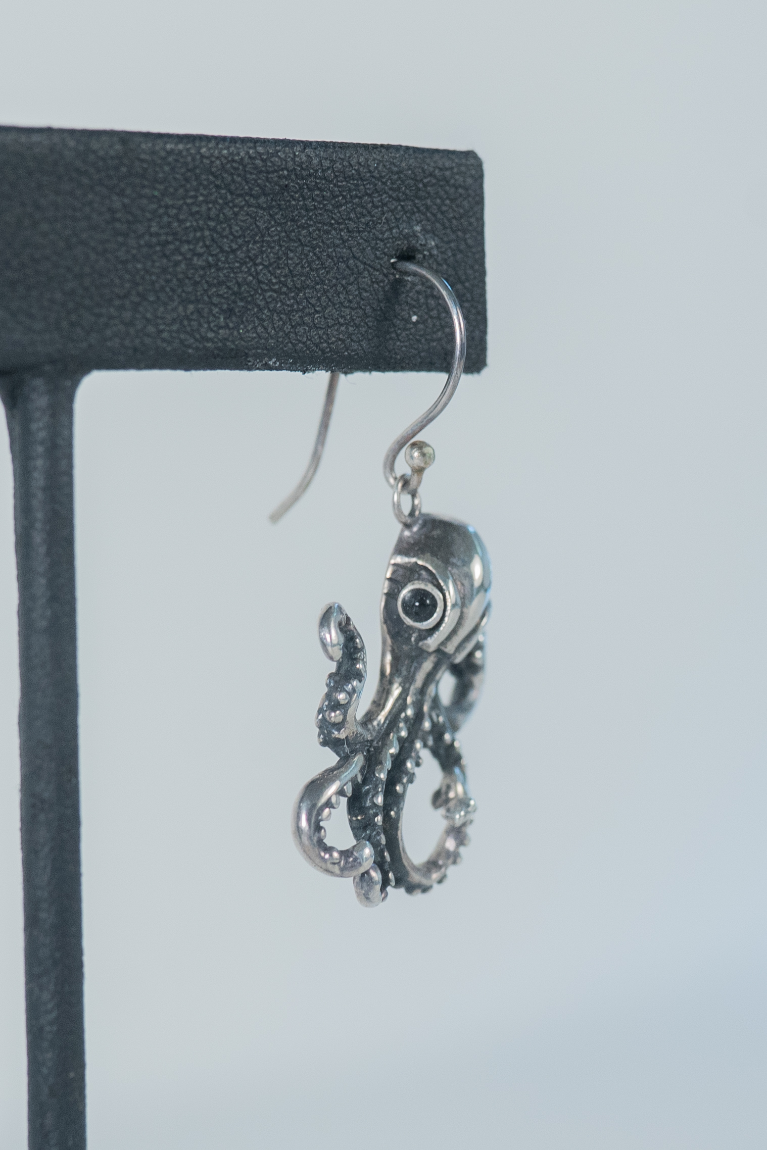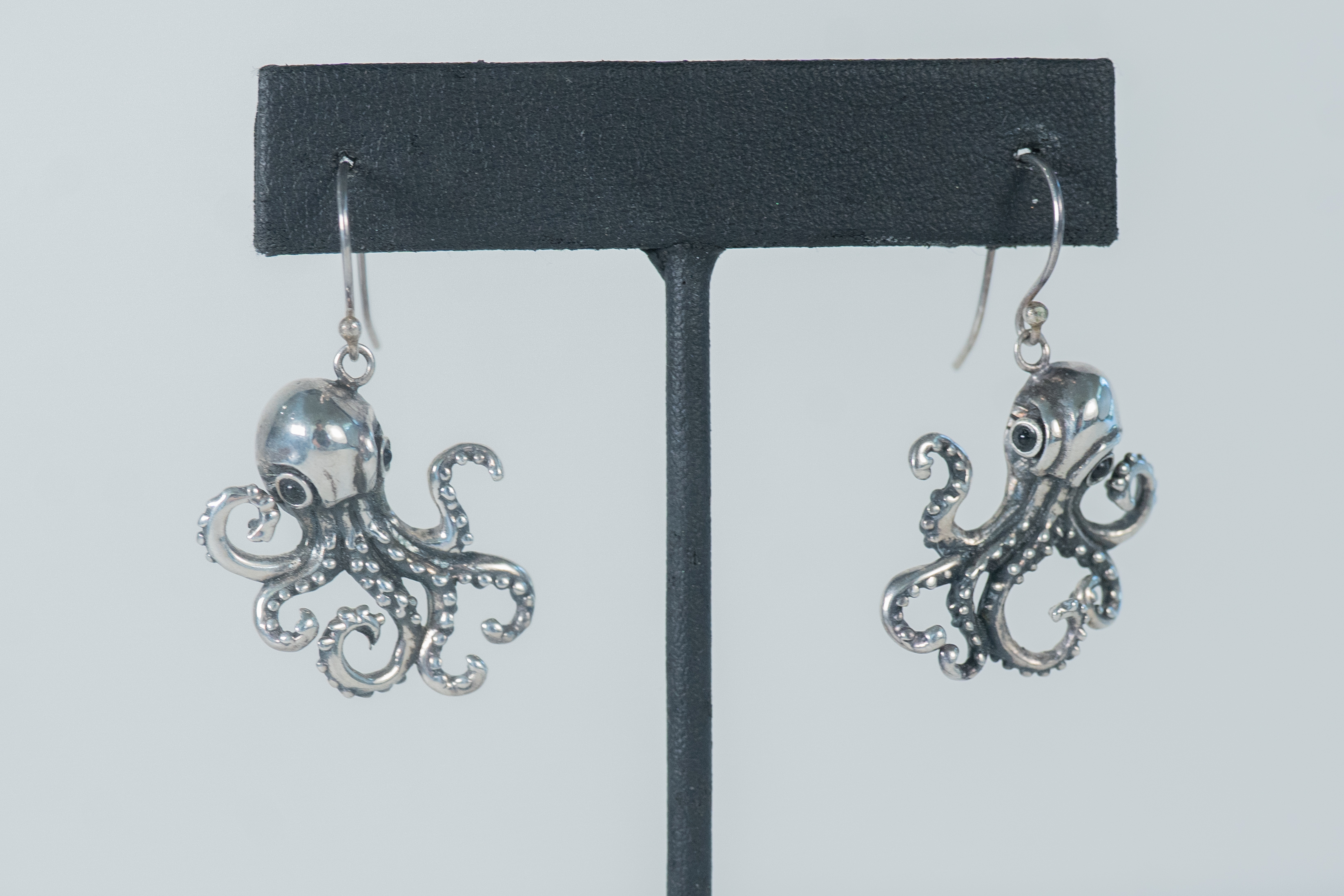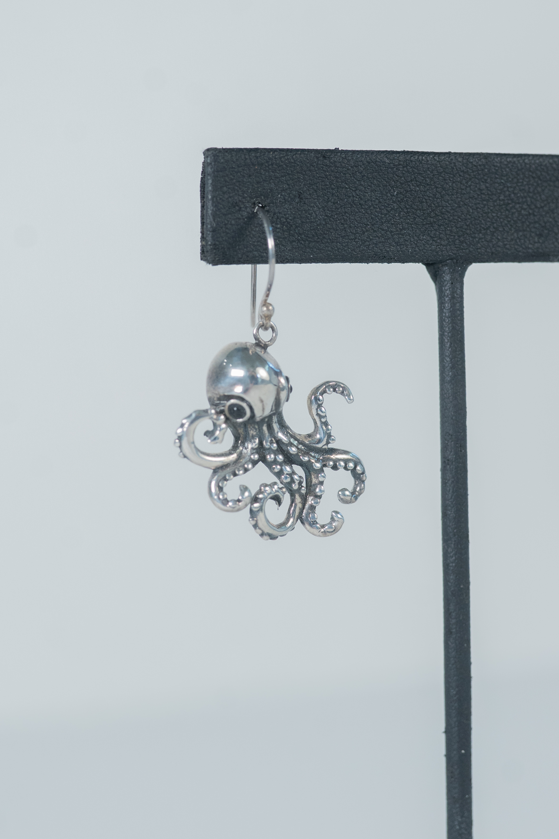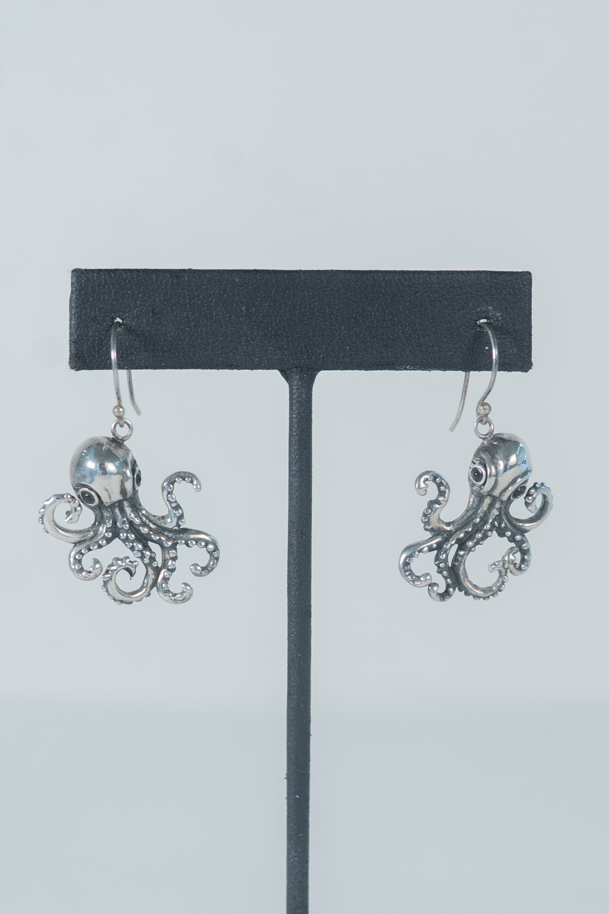 Whimsical Sterling Silver Octopus wire earrings with garnet eyes and suction cup details on its legs. Length 1 1/4″ x 7/8″ Width