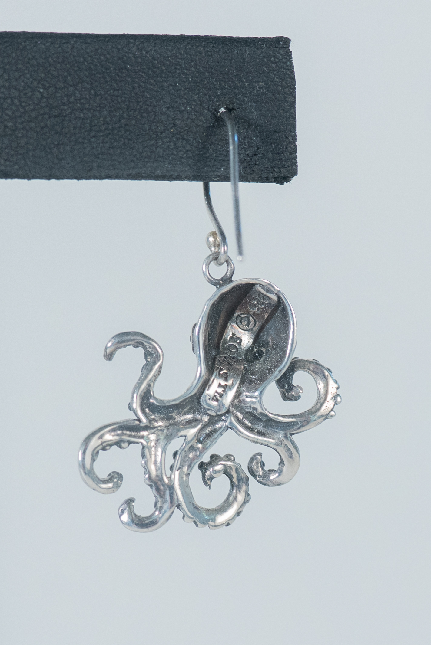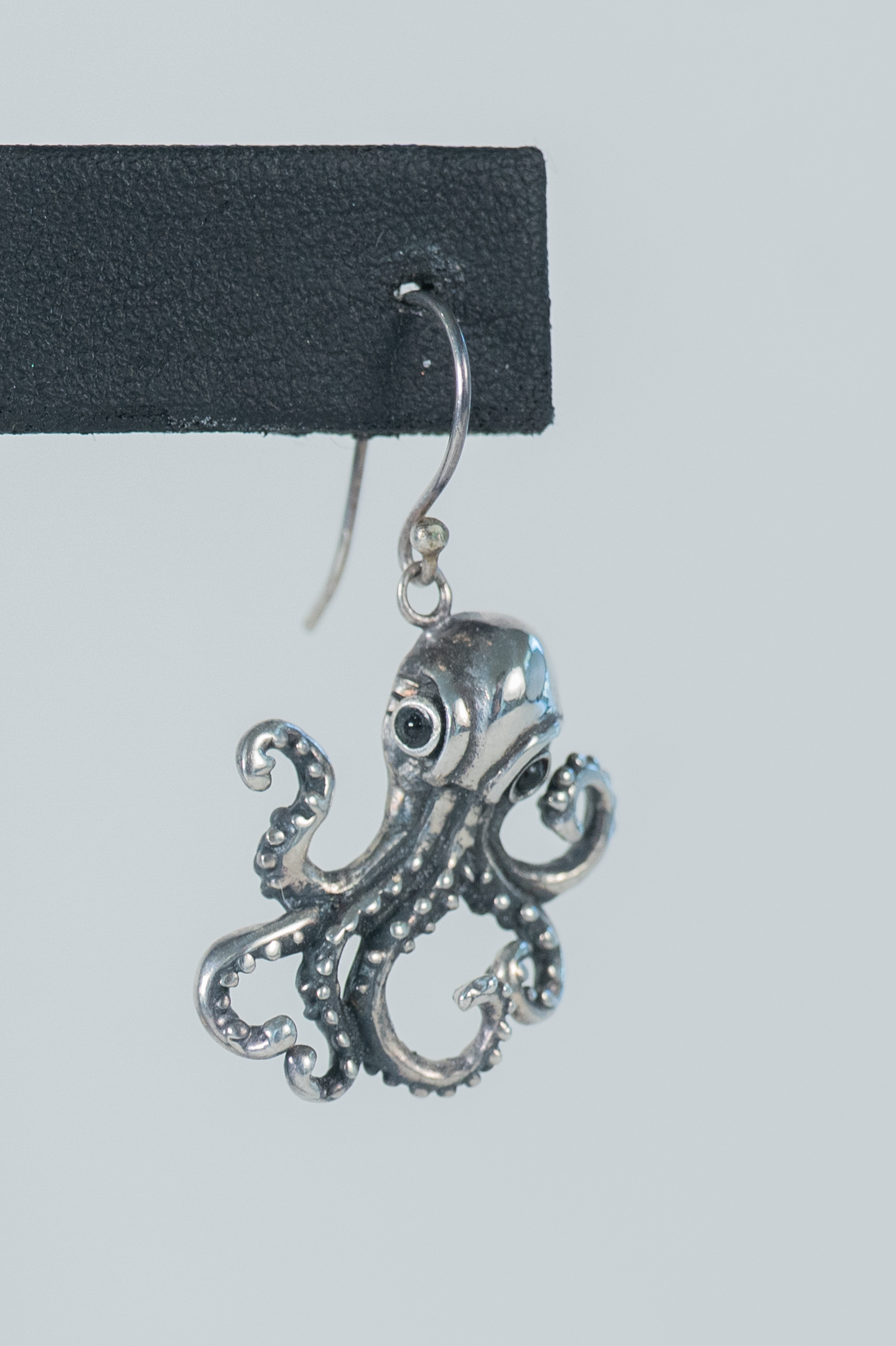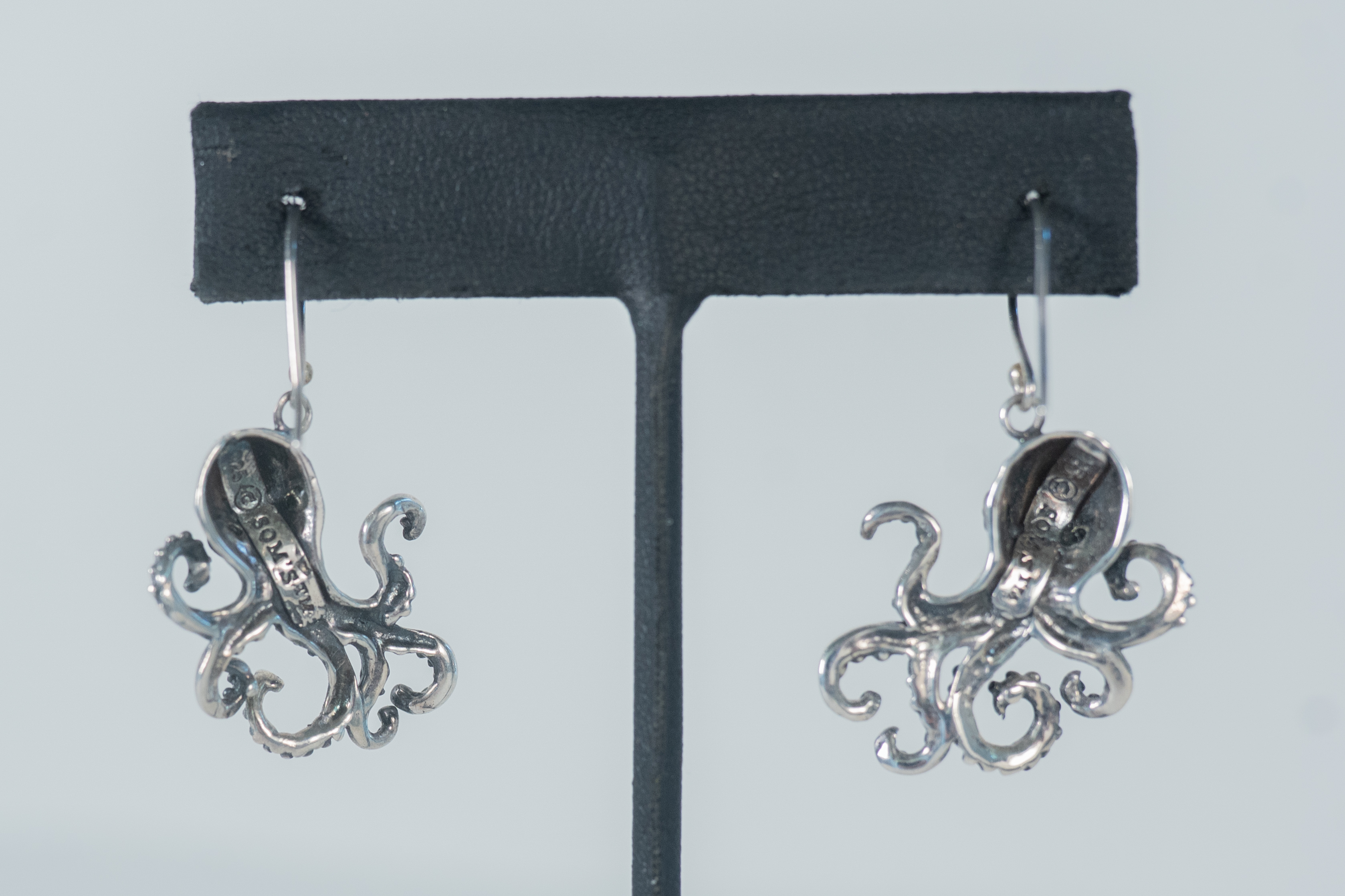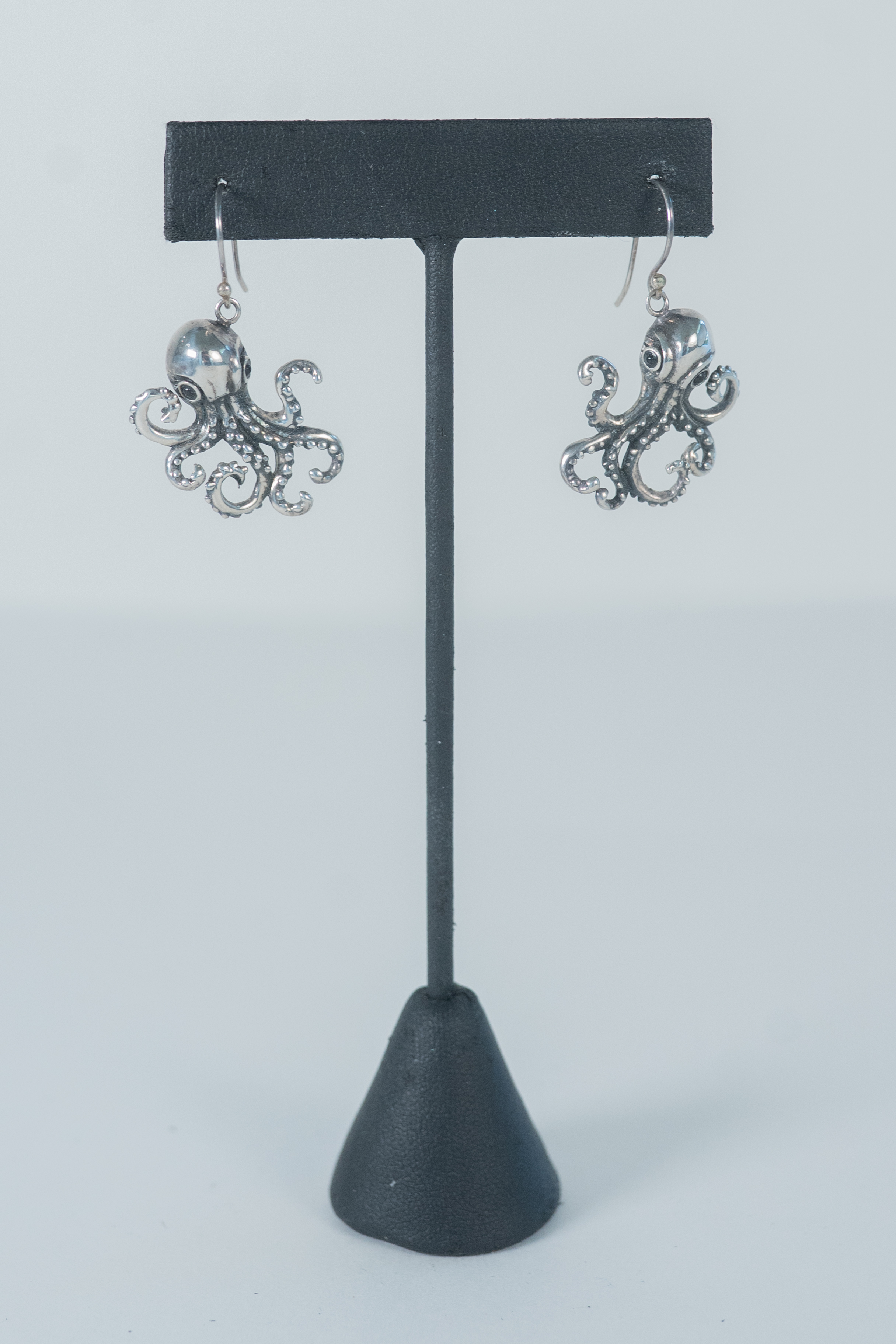 Whimsical Sterling Silver Octopus wire earrings with garnet eyes and suction cup details on its legs. Length 1 1/4″ x 7/8″ Width